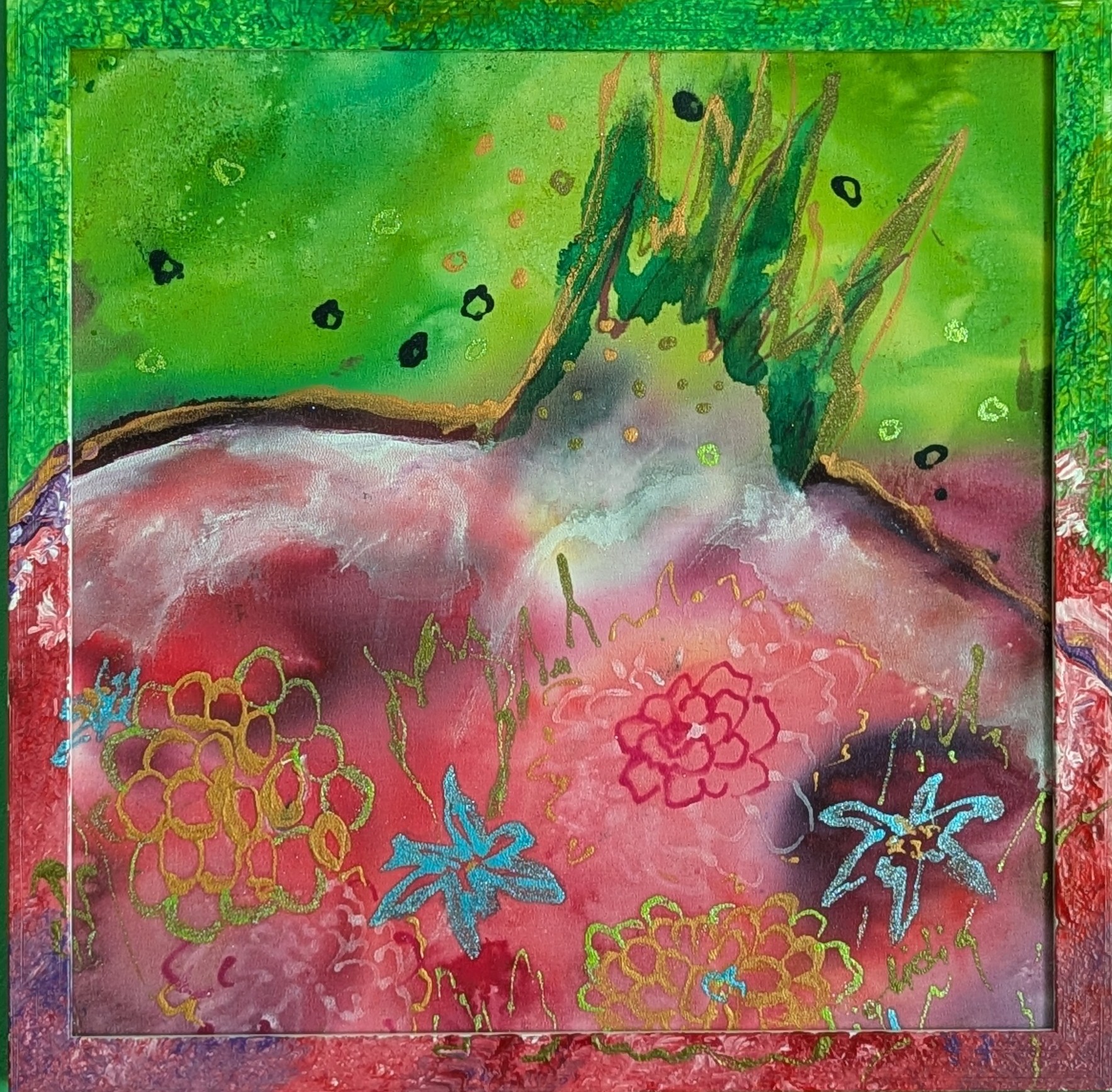 MATERIALS: painting on silk, wooden frame with hand-painted acrylic paints