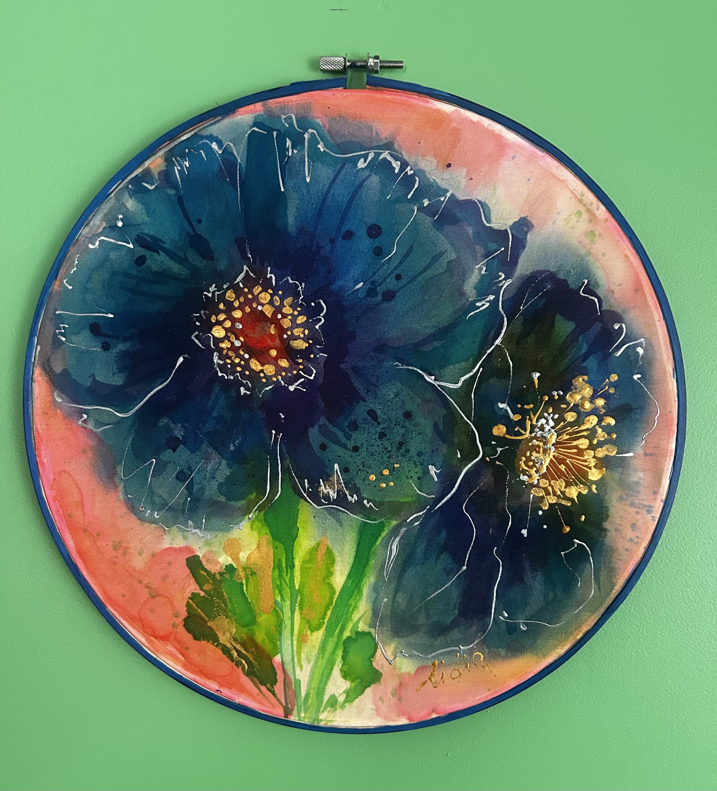 Blue Poppy Blue Poppy MATERIALS: silk, paint on silk, wooden hoop SIZE: 12” diameter CREATION DATE: 2026 PRICE: $40